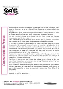 Communiqué de presse (12 février 2023) Communiqué de Presse du 12 février 2023 Christophe DENIZOT2026-02-01T08:48:20+01:00 Partager cet article avec les autres ! FacebookXLinkedInPinterestEmail Articles similaires Derrière les défaillances d’entreprise, ce sont les salarié(e)s et leurs familles qui trinquent ! Galerie Derrière les défaillances d’entreprise, ce sont les salarié(e)s et leurs familles qui trinquent ! 4 avril 2026 Guerre = DANGER sur l’emploi Galerie Guerre = DANGER sur l’emploi 14 mars 2026 Le 8 mars n’est pas une fête, c’est une journée de lutte ! Galerie Le 8 mars n’est pas une fête, c’est une journée de lutte ! 21 février 2026 « Néorégression » ou l’art d’humilier une profession ! Galerie « Néorégression » ou l’art d’humilier une profession ! 20 décembre 2025