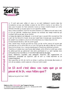 Communiqué de presse du 10 avril 2023 Communiqué de Presse du 10 avril 2023 Christophe DENIZOT2026-02-01T09:03:24+01:00 Partager cet article avec les autres ! FacebookXLinkedInPinterestEmail Articles similaires Derrière les défaillances d’entreprise, ce sont les salarié(e)s et leurs familles qui trinquent ! Galerie Derrière les défaillances d’entreprise, ce sont les salarié(e)s et leurs familles qui trinquent ! 4 avril 2026 Guerre = DANGER sur l’emploi Galerie Guerre = DANGER sur l’emploi 14 mars 2026 Le 8 mars n’est pas une fête, c’est une journée de lutte ! Galerie Le 8 mars n’est pas une fête, c’est une journée de lutte ! 21 février 2026 « Néorégression » ou l’art d’humilier une profession ! Galerie « Néorégression » ou l’art d’humilier une profession ! 20 décembre 2025